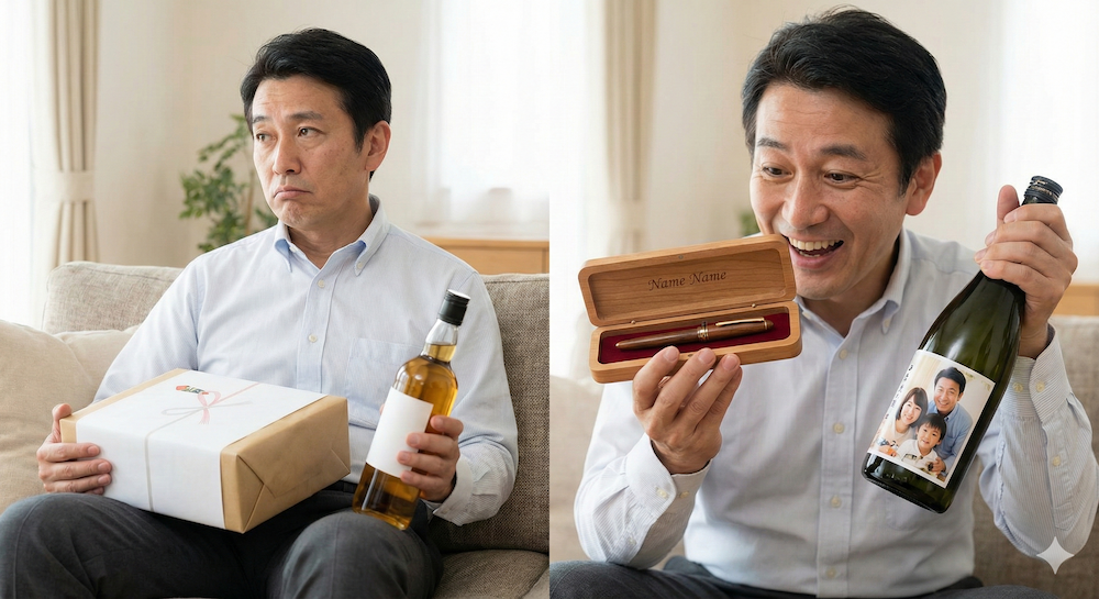 しかし、同じ「お酒」や「ボールペン」でも、そこにお父さんの名前や「お疲れ様」というメッセージが刻まれているだけで、受け取った時のインパクトは全く違います。