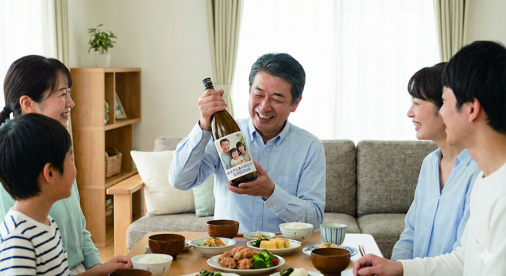 ● 最高の肴(さかな): 特にお孫さんの写真入りボトルは効果絶大。「孫を見ながら飲む酒は最高だ」と喜ばれること間違いなしです。